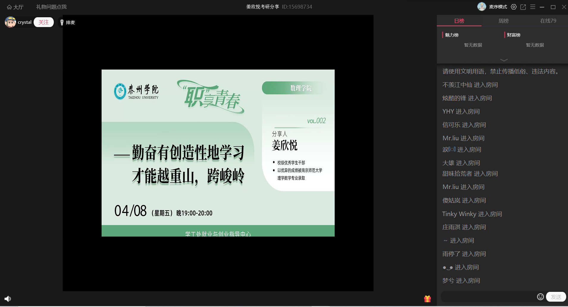 4月8日19点,公司举办考研经验分享交流会。此次交流会邀请了以优异成绩被m88理学数学专业录取的18级数学与应用数学(师范)专业姜欣悦同学,辅导员赵洁、2019级和2020级部分同学参加了本次分享会。