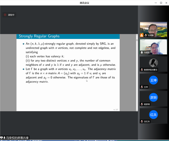 报告会上,冯荣权教授从强正则图的研究背景入手,详细介绍了强正则图在统计学、欧几里得几何、群论、有限几何和极值组合学等领域的广泛应用。随后,冯荣权教授系统阐述了在研究强正则图时涉及到的谱方法、群论、几何学以及格理论。最后,冯荣权教授详细介绍了他的团队关于强正则图两个方面的推广,即强L-路正则图和有向强正则图。报告会后,部分教师与冯教授进行了热烈地交流和讨论。