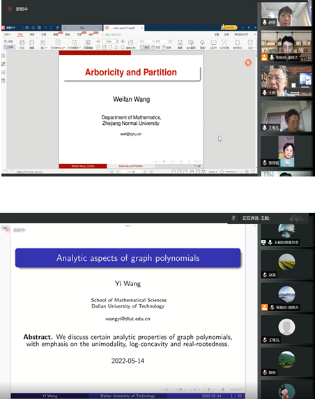 王维凡教授的报告题目是《Arboricity and Partition》。王维凡教授深入浅出地讲解了边分解、荫度、线性荫度和线性k-荫度等概念及其推广,详细给出了这些概念的相关研究成果,并提出若干公开问题。王毅教授的报告题目是《Analytic aspects of graph polynomials》,王毅教授生动细致地介绍了多种图多项式,讨论了它们的解析性质,重点讨论了单峰性、对数凹性和实根性,说明了图多项式在图论研究中的重要地位。报告会后,两位教授还与大家进行了深入的讨论和交流。