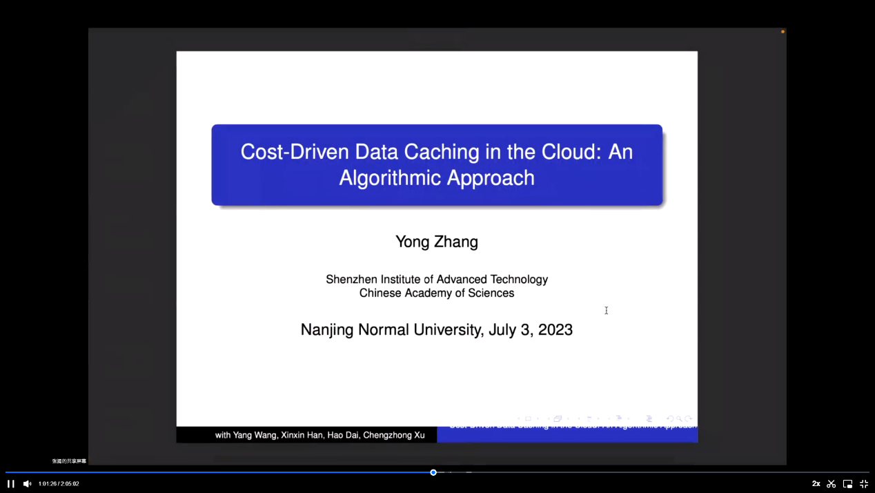 绝对值方程及其相关优化问题在许多领域中频繁出现,其重要性和广泛性使得对其求解方法的研究变得至关重要。在这次报告中,韩德仁教授介绍了改进的Douglas Rachford方法,并介绍了该方法的理论基础和数值实现,展示了其在绝对值方程和优化问题中的应用效果。优化云中数据缓存的新算法可降低成本并提高数据应用程序质量。张涌研究院介绍了一种用于优化云中数据缓存的创新算法,该算法可有效降低成本,并提高各种数据应用程序的质量。他们的研究团队在对共享数据项的请求流进行分析后,提出了一种基于最短路径的优化算法。与以往的研究相比,这项研究取得了显著的突破。报告结束后,大家踊跃提问,韩德仁教授和张涌研究员与大家进行了深入的讨论和交流。