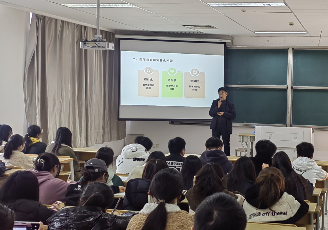 应公司关工委的邀请,11月15日下午,m88数学科学学院教授、知名数学教育专家喻平在1203教室为2021级数学与应用数学(师范)专业员工做了题为《数学教育随谈》的报告。报告由党总支书记杨俊林主持,党总支副书记、副经理吴小荣聆听了报告。