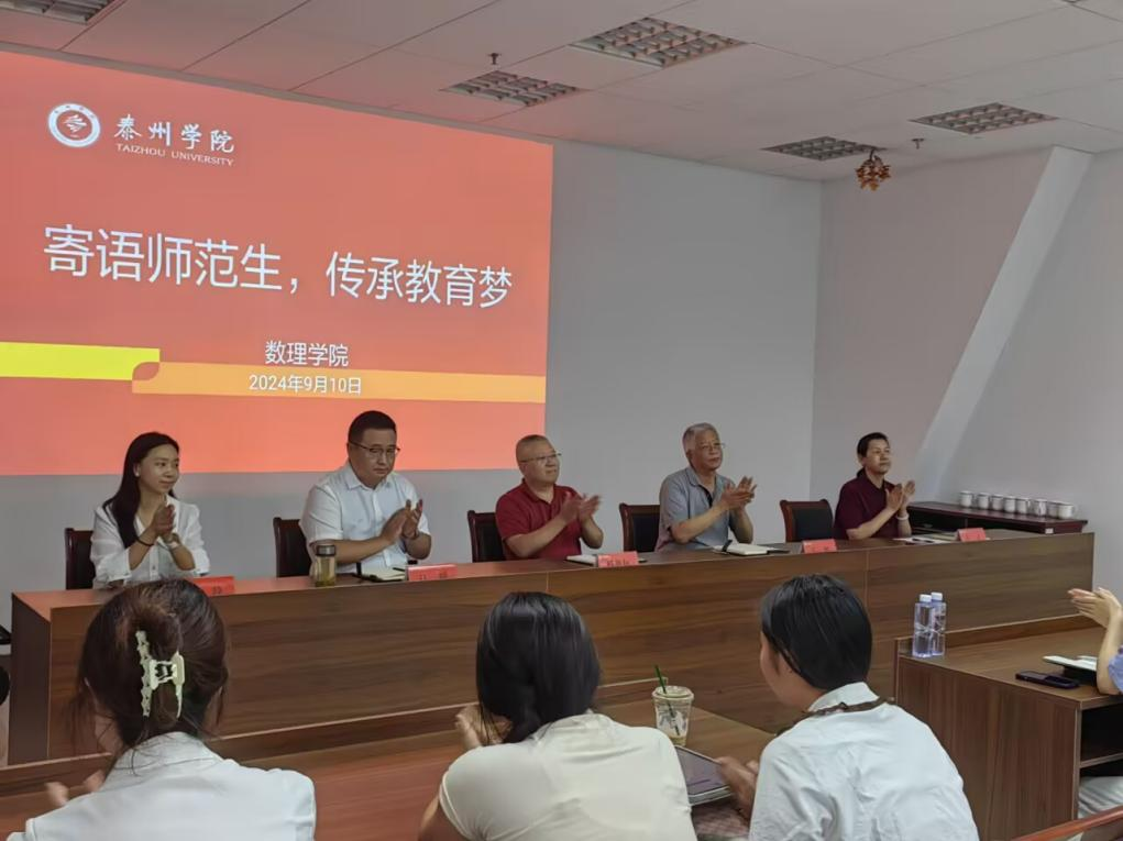 王彬老师围绕增强教书育人的本领分享了从教经历和人生感悟,希望同学们保持学习热情、爱心传递、耐心引导、勇于担当、追求卓越。杨俊林老师从教育家精神内涵讲起,通过分享数学家华罗庚的故事勉励大家勤学苦练、乐教爱生、加强自己的修养,勉励师范生要勇当新时代教育家。最后,江峰书记要求师范生要坚定理想信念,不忘初心,养成终身学习的习惯,打牢师范生基础知识,提升教学能力,自觉践行和发扬“扎根、生根、勇闯、善创”的泰院精神,内化于心,外化于行,并努力运用到今后的学习工作中去。师范生代表22数师2班纪名扬同学作表态发言,承诺作为新时代师范生会努力提升育人本领,坚持弘扬教育家精神,争取以后做一名优秀的人民教师。