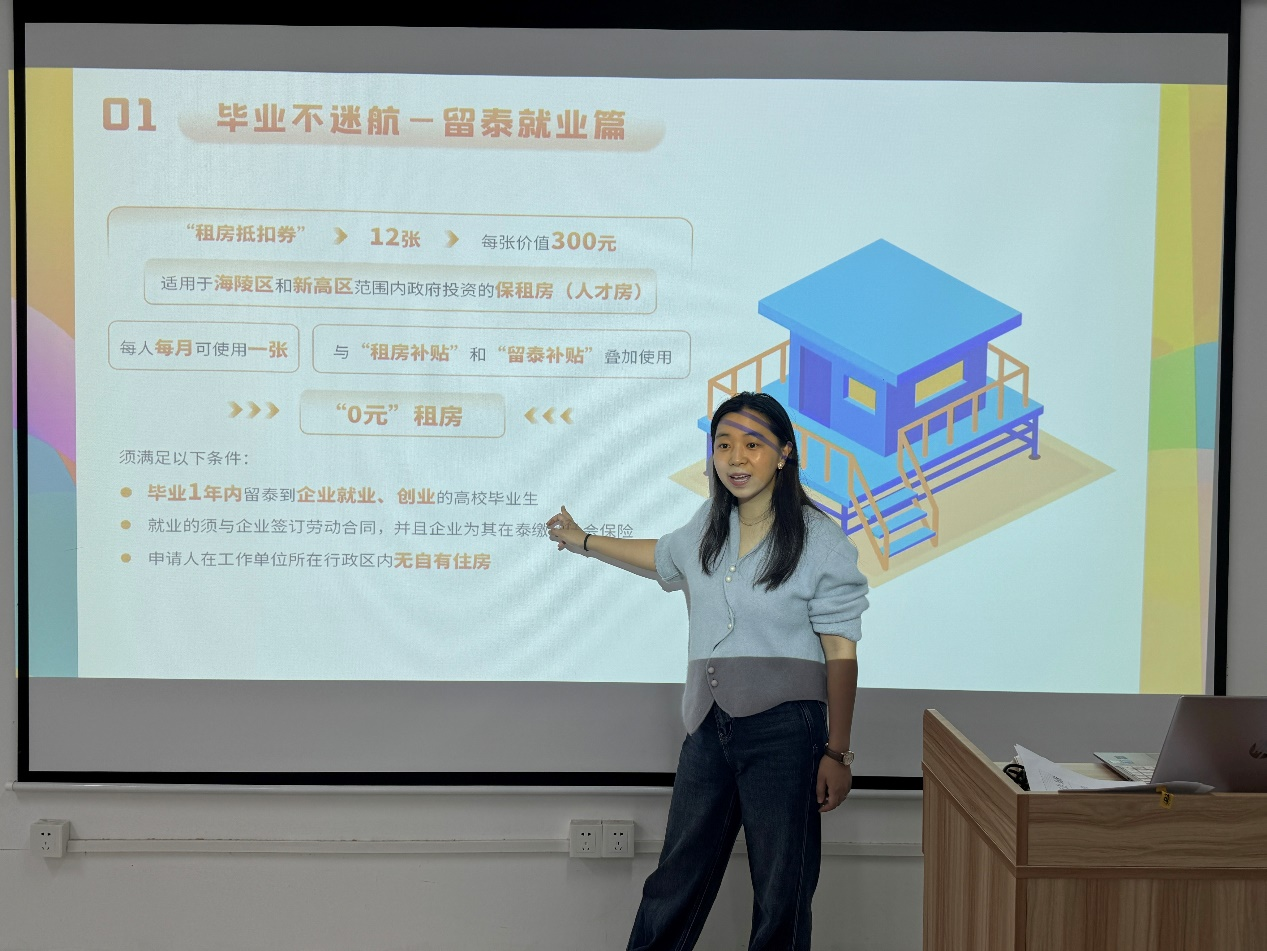 11月13日和11月23日,公司先后在一站式员工服务中心和教学楼2108教室,在21级和22级全体员工中开展了“留泰宣讲”活动。公司党总支副书记、副经理赵云、团总支书记庞静、21级辅导员单颢青对留泰政策进行了宣讲。