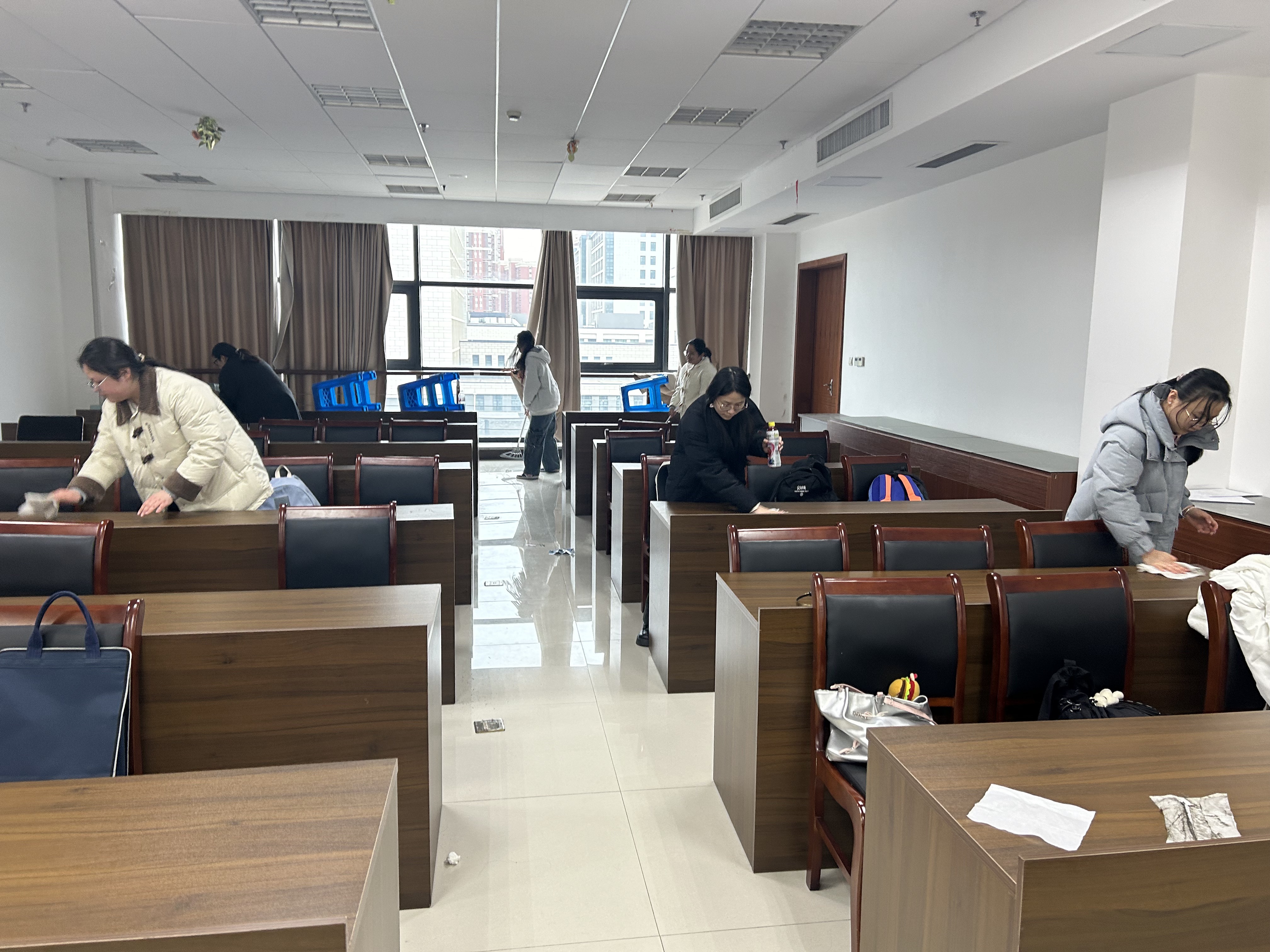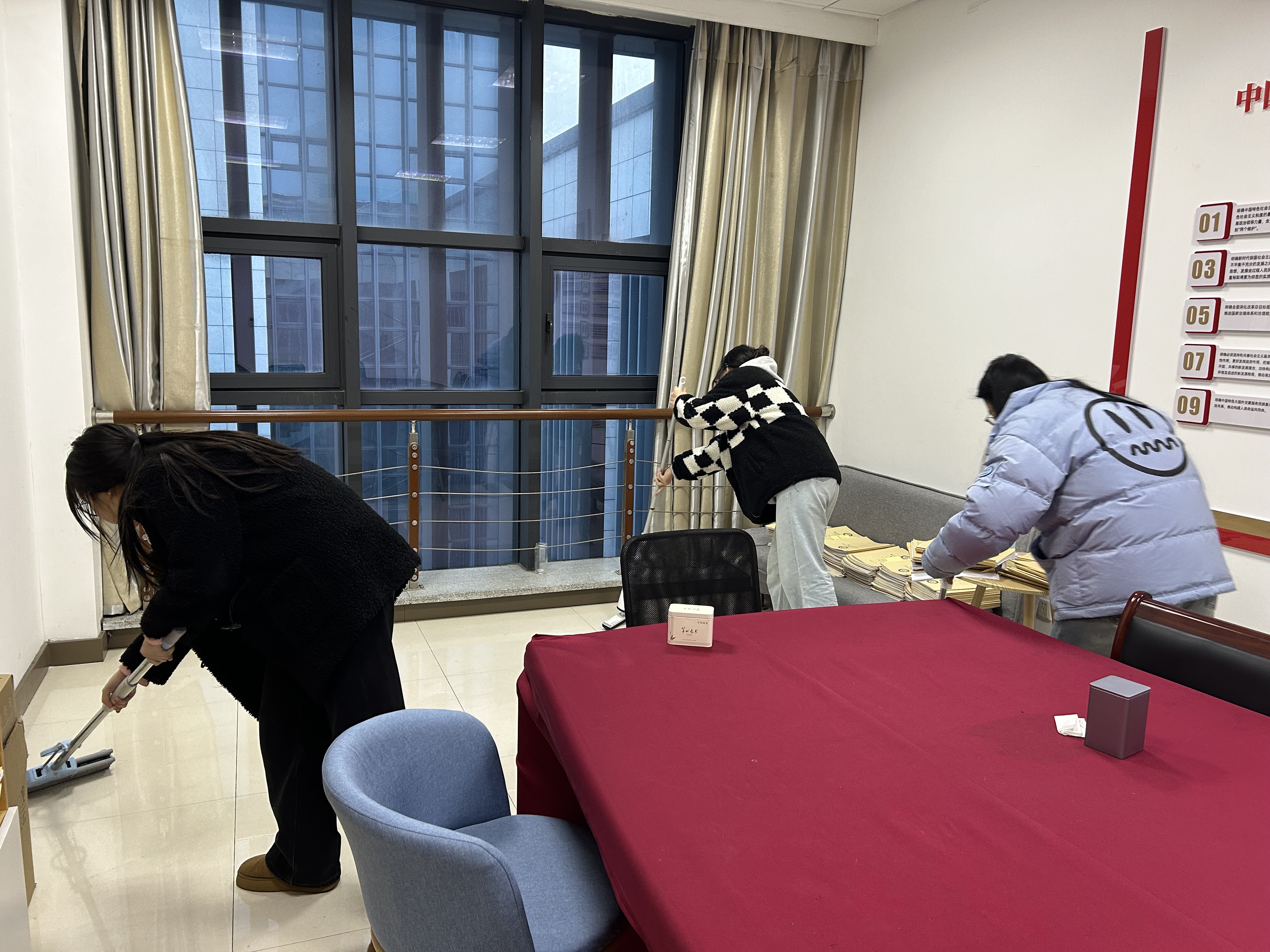 劳动过程中,同学们化身“校园美容师”,分工明确、高效协作。大会议室组8名同学采用“分区包干”模式,从桌椅摆放到地面清洁,从窗帘除尘到设备摆放,高标准完成环境打扫;小会议室组创新“流水线作业”,3人团队分区域完成资料分类、柜体、地面清洁等环节,让整个空间焕然一新;办公室清洁组则注重“个性化服务”。