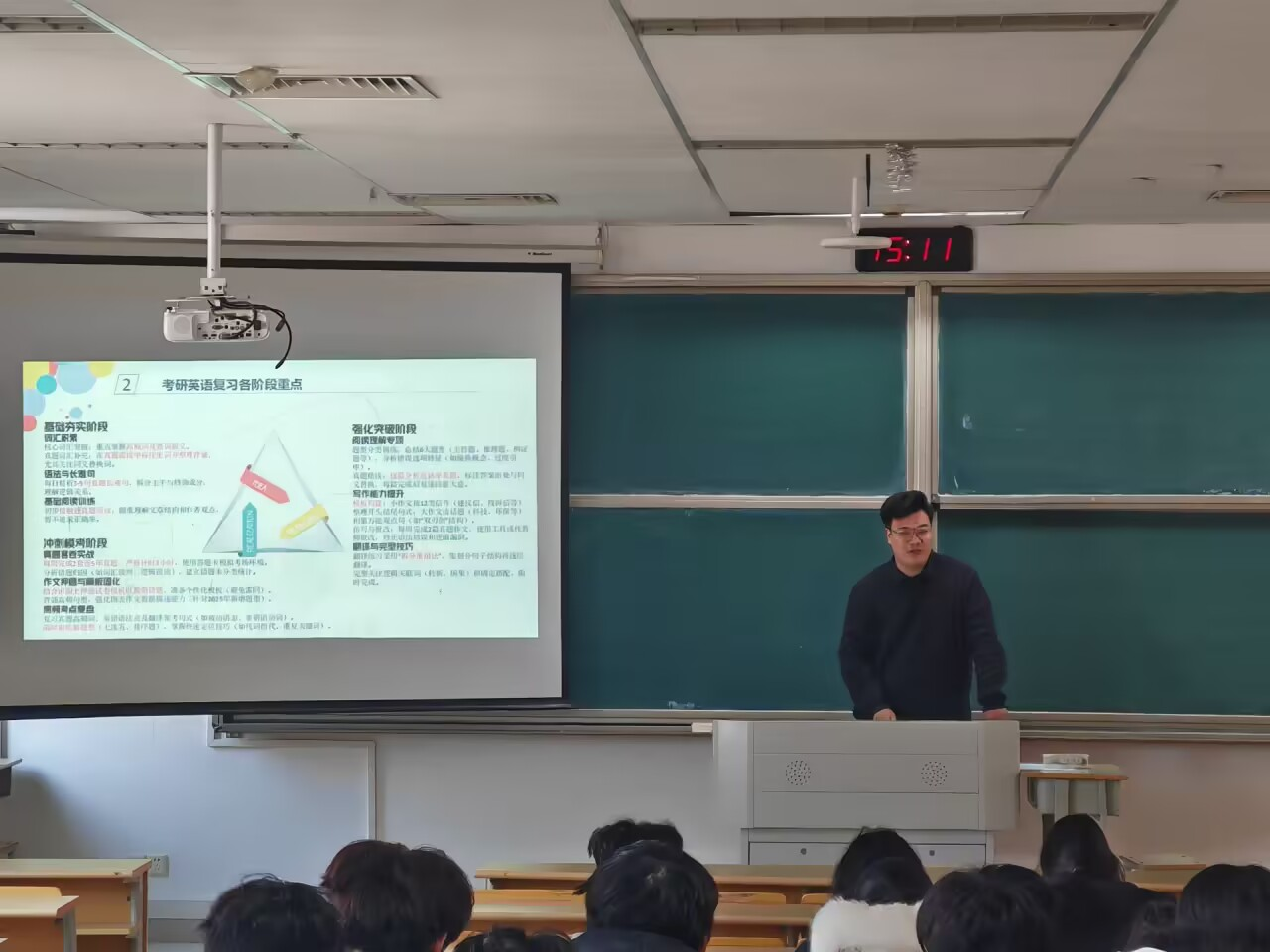 讲座中,李老师指出夯实英语单词是基础,建议同学们结合真题做熟词偏义练习。此外,他还分享时政与专题结合的备考策略,助力同学们精准把握政治命题趋势。廖老师则聚焦数学考研,剖析备考要点,鼓励同学们根据个人兴趣和职业规划选择目标院校。同时,廖老师强调,钻研真题、整理错题能够有效提升解题能力和思维水平。两位老师的精彩讲解为考研学子提供了实用建议,增强了备考信心。