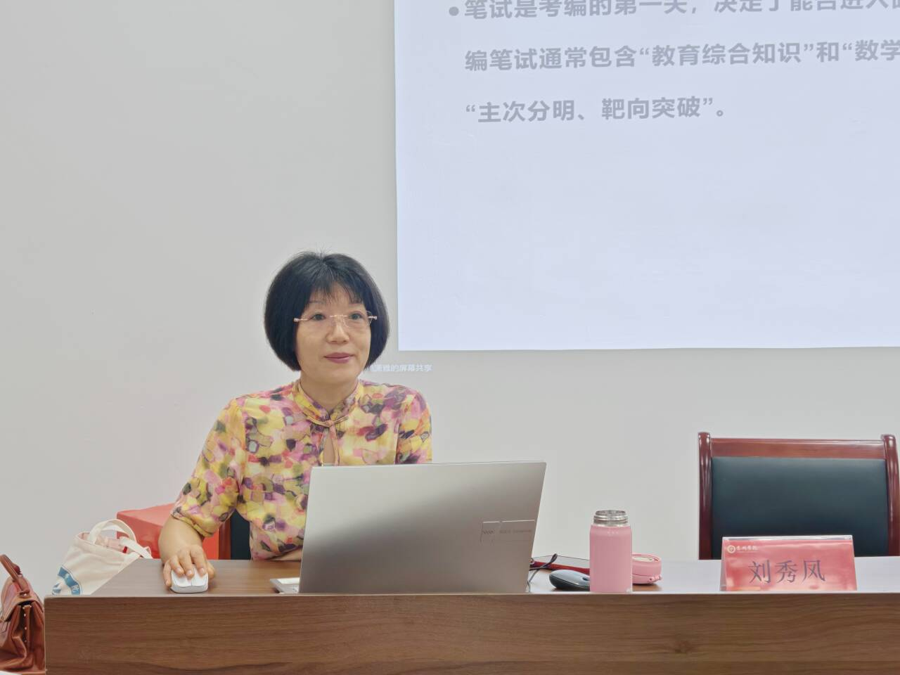 会上,窦平员工以“为思维生长而教”为主题,从哲学的角度出发,剖析国内外数学教育思维研究的现状,强调思维、热情与能力相互赋能是驱动教育成效的关键。刘秀凤员工则聚焦考编复习,提出“从简单到复杂”的备考路径,指出笔试需夯实学科基础,面试应注重细节。严小兵员工结合自身经验,系统分享了论文的写作方法与实用技巧,突出逻辑结构和学术规范在论文撰写中的关键作用。最后,邓昌滨员工深入剖析“有编”与“无编”岗位差异,围绕考编中的关键环节,建议师范生要强化学科知识储备,提升师范生基本功素质,提前开展教学设计训练,积累案例经验。