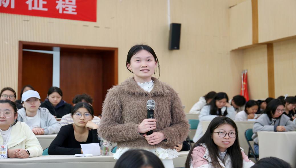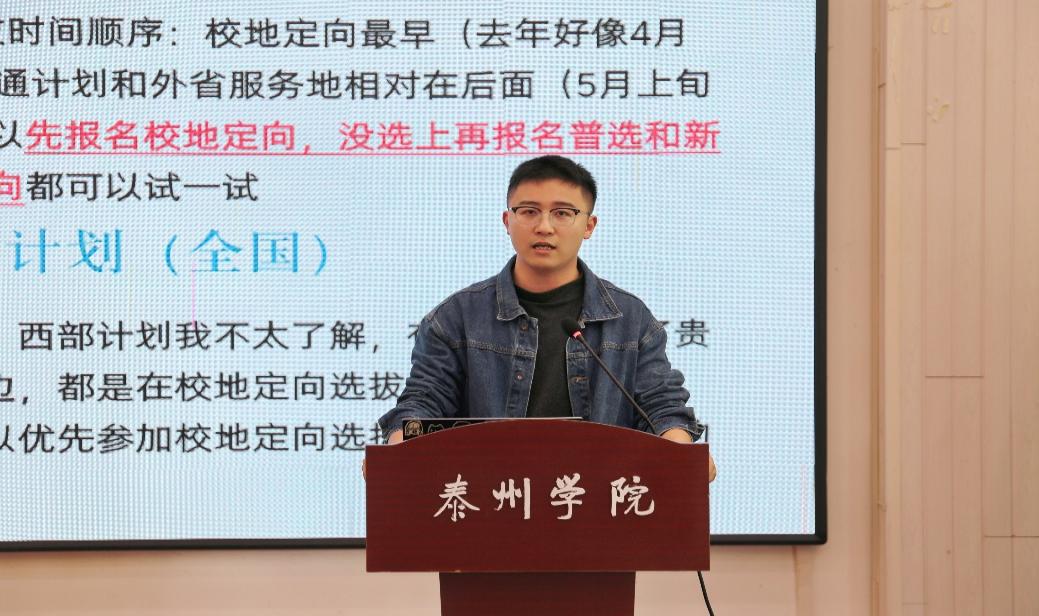 在分享环节,公司25届毕业生韩宁讲述了她扎根西部边疆、在新疆和静县社保中心开展基层服务的实践经历,并详细分享了在民族地区工作的沟通技巧;外国语公司25届毕业生郝时雨结合自己在泰州高港区服务期间的经验,介绍了如何平衡基层工作与考研备考、最终成功考研升学的宝贵时间管理方法;经管公司24届毕业生张静敏则回顾了在胡庄镇基层服务的经历,梳理了从“优秀志愿者”到考取泰州民政部门岗位的成长路径。互动环节中,三位嘉宾围绕西部计划和乡村振兴计划的报名流程、备考策略、岗位适应等共性问题,为现场同学作了细致解答。